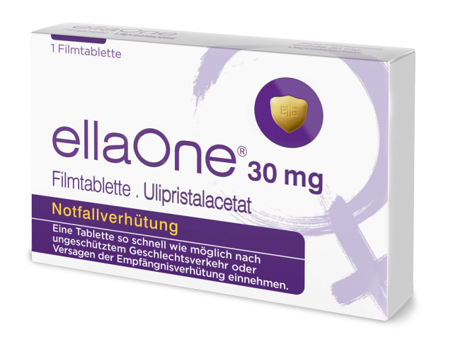 ellaOne® 30 mg Filmtablette. Zusammensetzung: 30 mg Ulipristalacetat, weit. Bestandteile: Lactose-Monohydrat, Povidon, Croscarmellose-Natrium, Magnesiumstearat. Polyvinylalkohol (E1203), Macrogol (E1521), Talk (E553b), Titandioxid (E171), Polysorbat 80 (E433), Eisen(III)-hydroxidoxid x H2O (E172), Muscovit (E555). Anwendungsgebiet: Notfallverhütung schnellstmöglich innerhalb von höchstens 120 Stunden (5 Tagen) nach ungeschütztem Geschlechtsverkehr bzw. im Fall des Versagens einer Kontrazeptionsmethode einnehmen. Gegenanzeige: Überempfindlichkeit gegen den Wirkstoff oder einen der sonstigen Bestandteile. Nebenwirkungen: Häufig: Übelkeit, abdominale (Bauch-)Schmerzen oder Unwohlsein in der Bauchgegend, Erbrechen, Menstruationsschmerzen, Beckenschmerzen, Spannungsgefühl in der Brust, Kopfschmerzen, Schwindelgefühl, Stimmungsschwankungen, Muskel-, Rückenschmerzen, Müdigkeit. Gelegentlich: Diarrhö, Sodbrennen, Blähungen, Mundtrockenheit, abnorme oder unregelmäßige Vaginalblutungen, starke/verlängerte Perioden, prämenstruelles Syndrom, Vaginalentzündung oder Ausfluss, abgeschwächte oder verstärkte Libido, Hitzewallungen, Appetitveränderungen, emotionale Störungen, Angst, allgemeine körperliche Unruhe, Schlafstörungen, Schläfrigkeit, Migräne, Sehstörungen, Influenza, Akne, Hautausschlag, Juckreiz, Fieber, Schüttelfrost, Krankheitsgefühl. Selten: Schmerzen oder Juckreiz im Genitalbereich, Schmerzen beim Geschlechtsverkehr, Ablösen einer Ovarzyste, ungewöhnlich leichte Periode, Konzentrationsverlust, Schwindel, Zittern, Verwirrung, Ohnmachtsanfälle, ungewöhnliches Gefühl in den Augen, rotes Auge, Lichtempfindlichkeit, trockener Hals, Beeinträchtigung des Geschmackssinns, allergische Reaktionen wie Hautausschlag, Nesselausschlag oder Anschwellen des Gesichts, Durstgefühl. Warnhinweise und Vorsichtsmaßnahmen für die Anwendung: So bald wie möglich nach dem ungeschützten Geschlechtsverkehr einnehmen. Beachten Sie die bereitgestellten Informationen zur möglicherweise verringerten Wirksamkeit bei gleichzeitiger Anwendung bestimmter Arzneimittel. Für alle Frauen im gebärfähigen Alter geeignet, auch für Jugendliche. Nicht für die regelmäßige Empfängnisverhütung. Nicht wirksam bei einer bereits bestehenden Schwangerschaft. Nicht in allen Fällen wirksam. Verschiebt den Eisprung. Apothekenpflichtig. Pharmazeutischer Unternehmer: Perrigo Deutschland GmbH, 70173 Stuttgart.