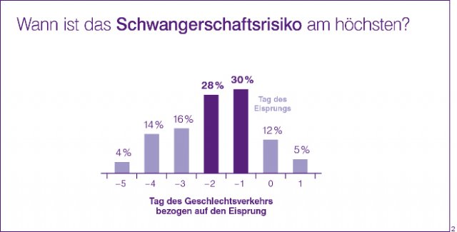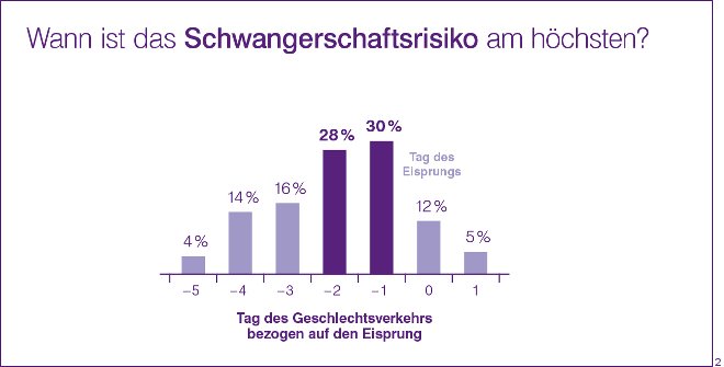 Das Schwangerschaftsrisiko ist in den beiden Tagen vor dem Eisprung am höchsten.2 Warum ist das so? Die Eizelle überlebt nach dem Eisprung zwar nur für kurze Zeit, Spermien sind aber bis zu 5 Tage befruchtungsfähig.3 So kann Geschlechtsverkehr, der mehrere Tage vor dem Eisprung stattfindet, zu einer ungewollten Schwangerschaft führen, da die Spermien sozusagen auf den Eisprung „warten“ können.